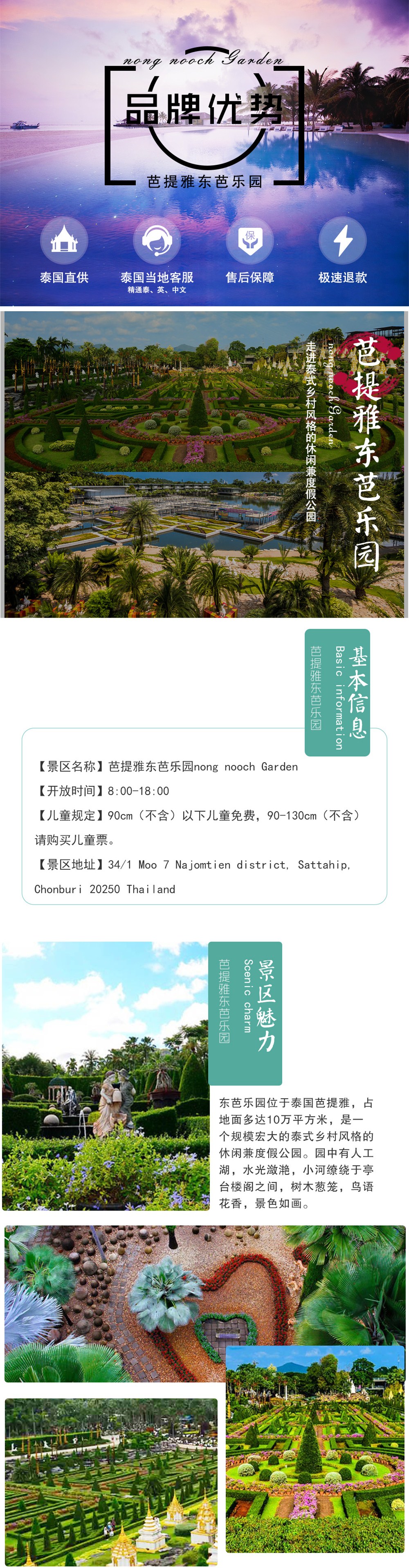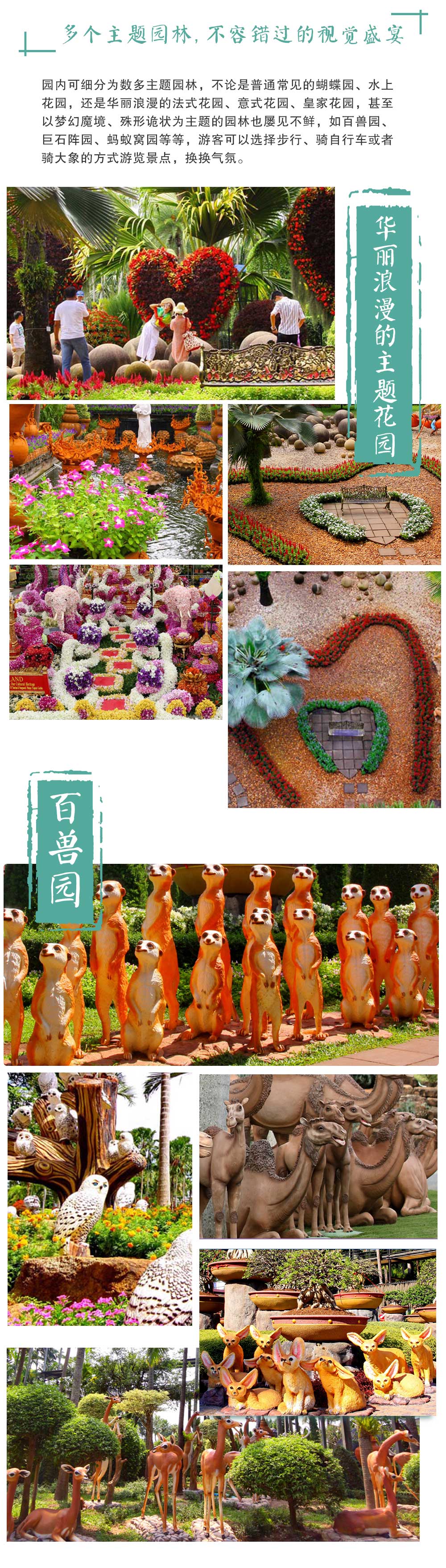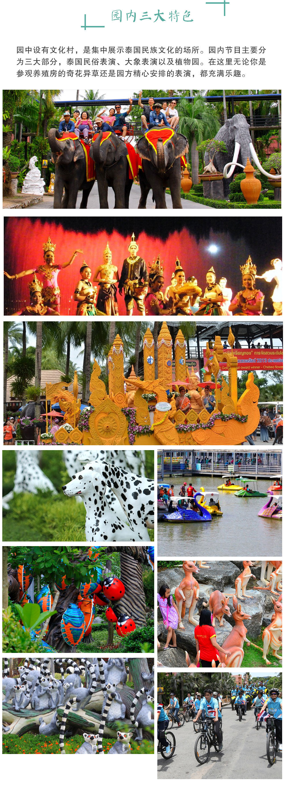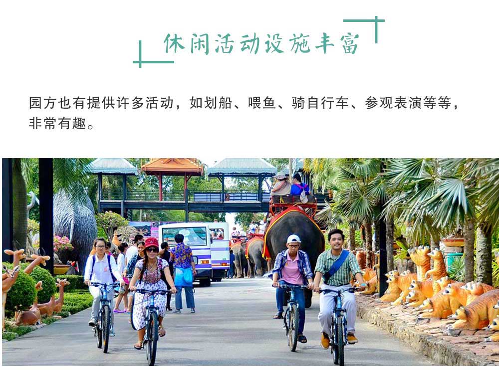 1.是东南亚规模最大的园林,里面又细分为若干园林,玩一整天也不会觉得腻。 2.园内可参与活动较多,最重要的是有提供度假村。