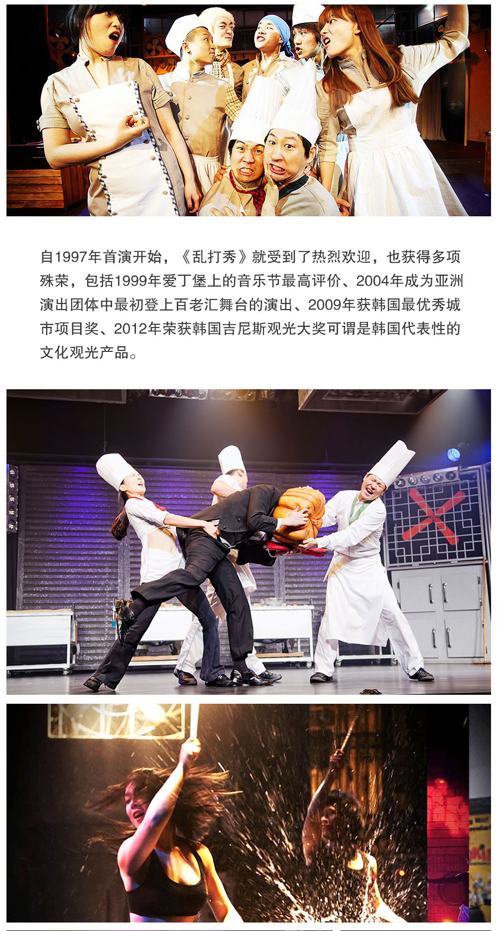 《乱打秀》以非语言性、观众参与为特色,融入了韩国传统音乐和戏剧的元素,將一个发生在后厨的平凡无奇的故事演绎出了生动而富戏剧性的表演,精彩纷呈,高潮叠起。
