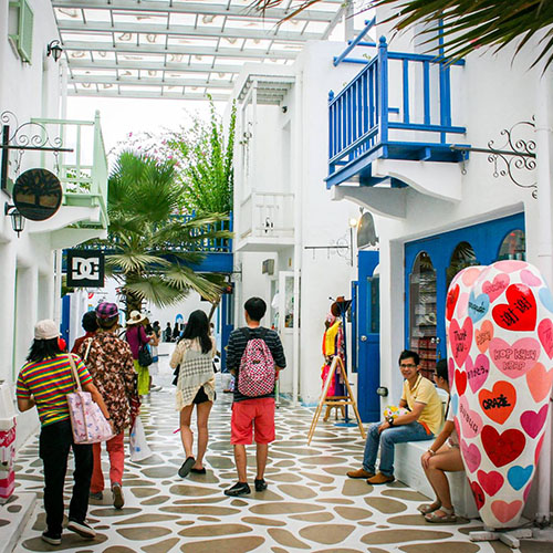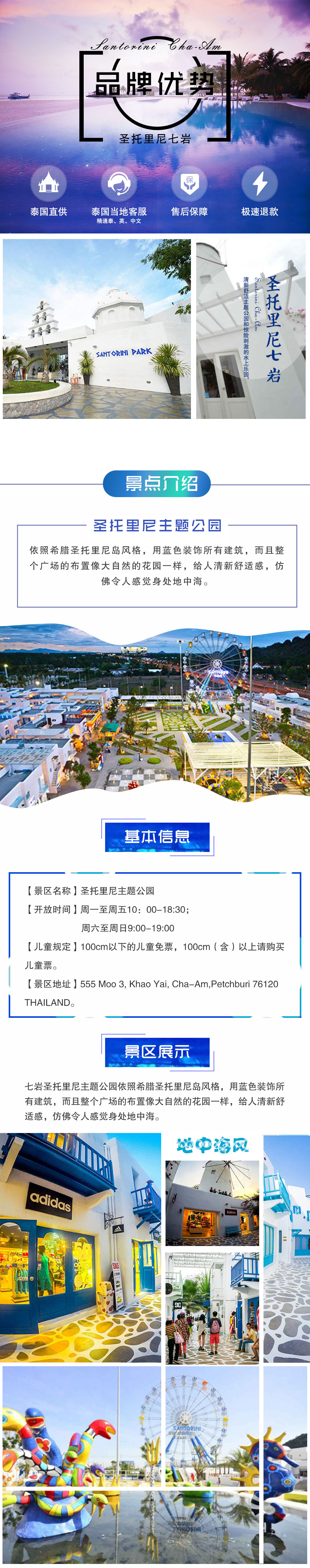 七岩圣托里尼主题公园依照希腊圣托里尼岛风格,用蓝色装饰所有建筑,而且整个广场的布置像大自然的花园一样,给人清新舒适感,仿佛令人感觉身处地中海。