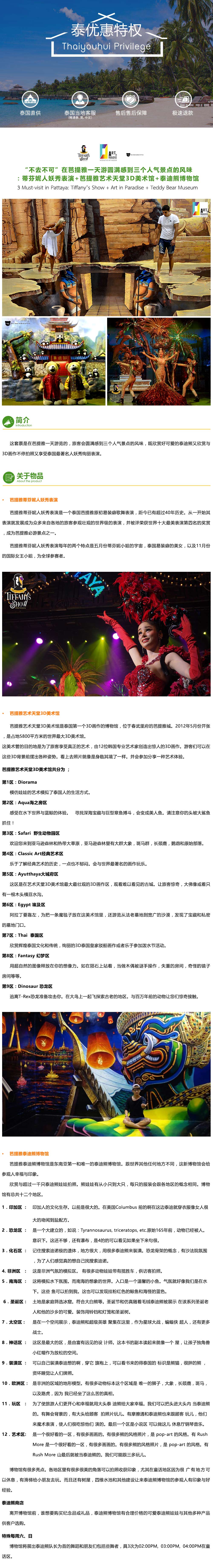 这套票是在芭提雅一天游览的,旅客会圆满感到三个人气景点的风味,既欣赏好可爱的泰迪熊又欣赏与3D画作不停拍照又享受泰国最著名人妖秀绚丽表演。