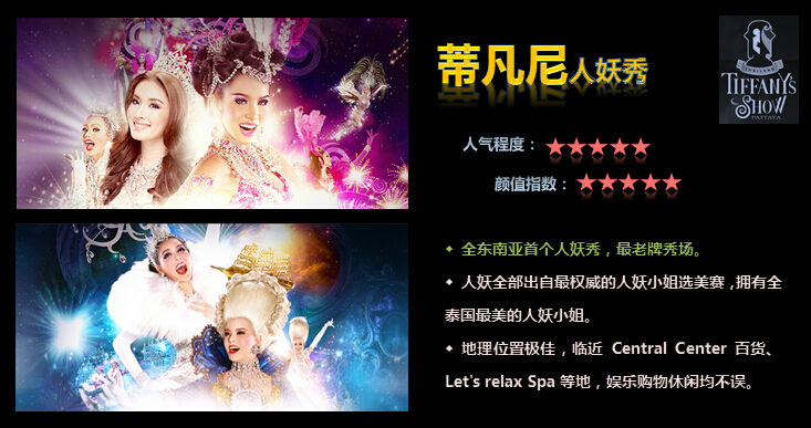 蒂凡尼人妖秀剧院位于泰国芭提雅,成立于1974年,是泰国乃至东南亚地区最早的人妖秀创业者,如今已经历了40余年的风雨创业。其表演内容富有新鲜感及时代精神,成为众多来自世界各地的游客印象最深的娱乐亮点之一。目前,蒂凡尼人妖秀这一企业品牌已经享誉全球了,因此屡次荣获各项奖誉,如2013年泰国最佳旅游企业奖、2011年泰国杰出创作成果奖等,并于2011年还被评为世界十大最美表演第四名。